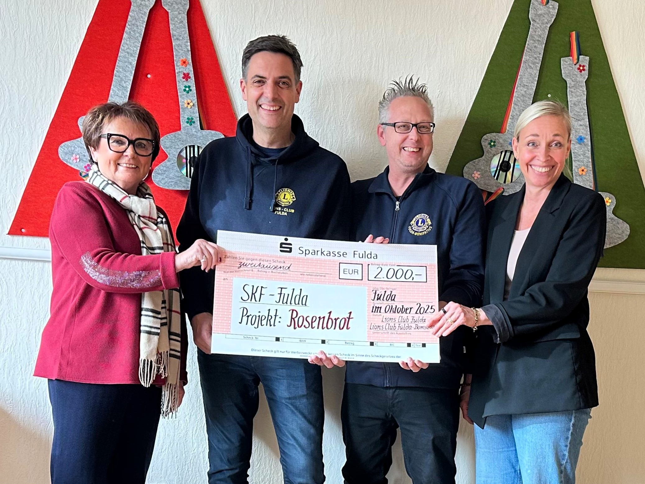 Fulda, 14. November 2025 – Mit großer Freude übergaben die beiden Lions Clubs Fulda und Fulda-Bonifatius Ende Oktober einen Spendenscheck über 2.000 Euro an den Sozialdienst katholischer Frauen (SkF) Fulda. Geschäftsführerin Sarah Muth und Vereinsvorsitzende Ursula Schmitt nahmen die Spende dankbar entgegen. Besonders strahlten jedoch die Kinder des "Projekts Rosenbrot", der pädagogischen Nachmittagsbetreuung in der Fuldaer Innenstadt, die bereits seit vielen Jahren von beiden Lions Clubs unterstützt wird.